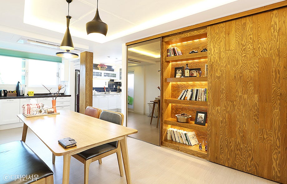 질감이 도드라지는 우드 패널과 따뜻한 간접조명이 만나 멋스러운 수납공간을 완성한 다이닝 공간입니다. 한쪽에는 거울을 설치하여 개방감을 살려 아늑한 공간을 연출했습니다.