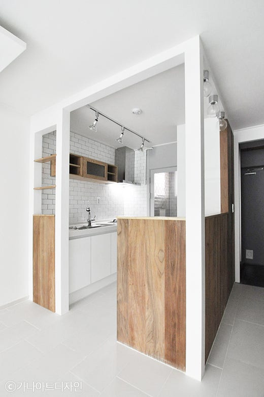 작은 평수에서 참고하기 좋은 화이트 톤의 주방구조에서 파티션과 선반을 원목으로 제작하여 내추럴하면서도 깔끔한 공간을 완성했습니다.